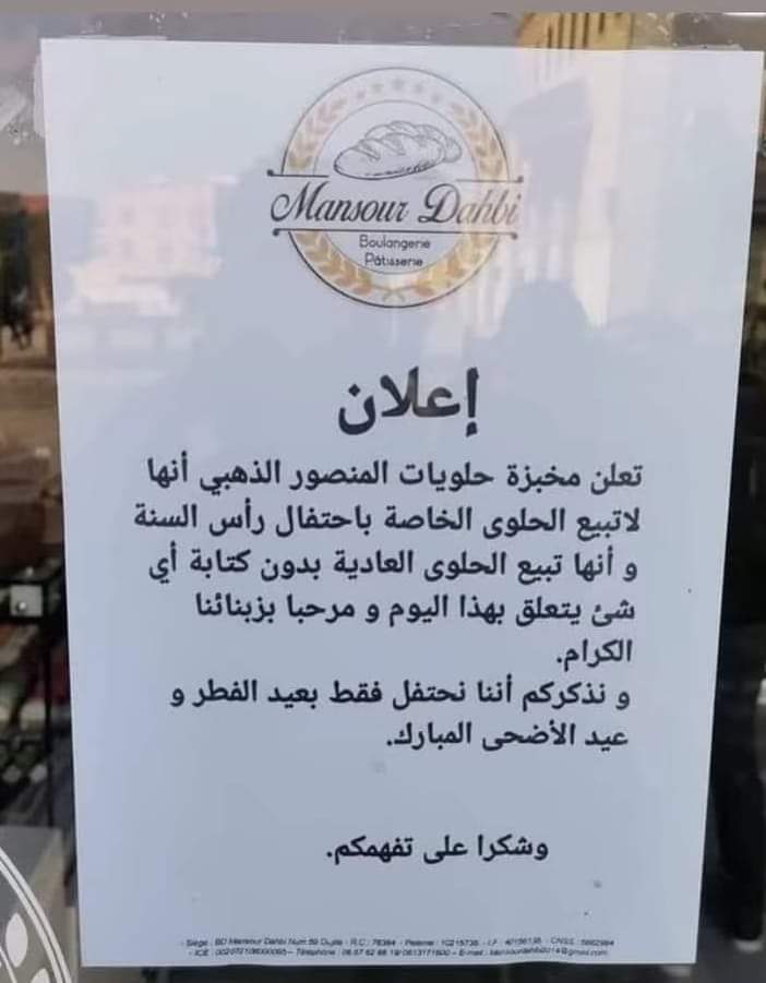 وكتب صاحب المخبزة إعلانا جاء فيه: “تعلن المخبزة أنها لا تبيع الحلوى الخاصة باحتفال رأس السنة، وأنها تبيع الحلوى العادية بدون كتابة أي شيئ يتعلق بهذا اليوم ومرحبا بزبنائنا الكرام ونذكركم أننا نحتفل فقط بعيد الفطر وعيد الأضحى المبارك”.