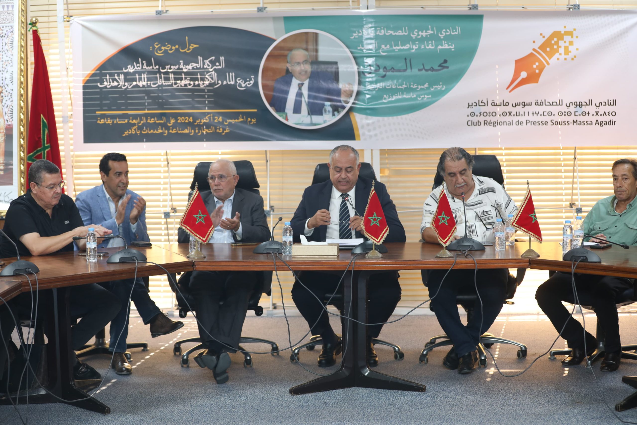 نظم النادي الجهوي للصحافة بسوس ماسة يوم الخميس 24 اكتوبر 2024 بقاعة غرفة التجارة والصناعة والخدمات بجهة سوس ماسة على الساعة الخامسة مساء لقاء تواصليًا حضره السيد محمد المودن، رئيس مجموعة الجماعات الترابية للتوزيع بسوس ماسة، إلى جانب عدد من الشخصيات البارزة منها النائب الأول لرئيس جماعة أكادير،السيد مصطفى بودرقة السيد سعيد الضور، رئيس غرفة التجارة والصناعة والخدمات بسوس ماسة، والسيد إسماعيل عنيبة، مدير التواصل بالشركة الجهوية المتعددة الخدمات، بالإضافة إلى مجموعة من الإعلاميين والصحفيين المهتمين بالموضوع.