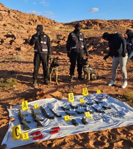 وقد مكنت عمليات التفتيش والتمشيط, التي استغرقت أكثر من ثلاث ساعات تقريبا، من العثور على شحنة من الأسلحة والذخيرة النارية مدفونة في مكان منزو أسفل المرتفع الصخري، كانت ملفوفة في أكياس بلاستيكية وجرائد ورقية منشورة بدولة مالي، من بينها أسبوعيات ورقية صادرة بتاريخ 27 يناير 2025.