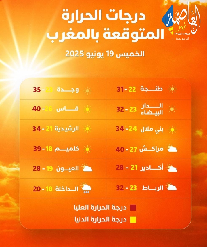 إليكم درجات الحرارة الدنيا والعليا المتوقعة اليوم الخميس بالمغرب ☀️
