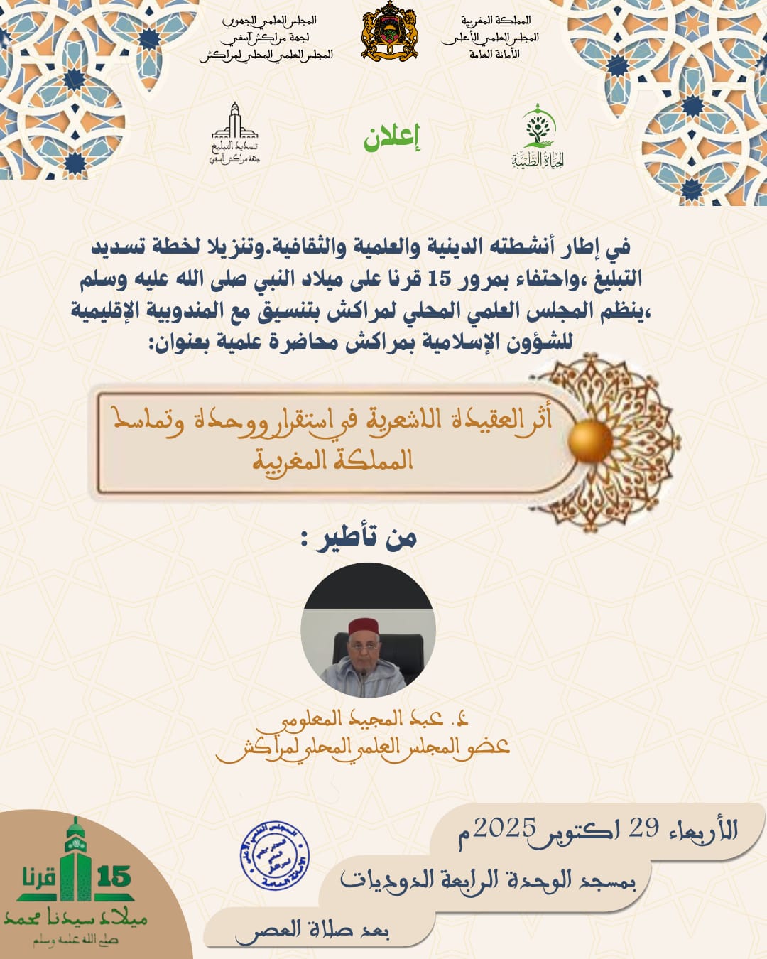 في إطار أنشطته الدينية والعلمية والثقافية، وتنزيلاً لخطة تسديد التبليغ، واحتفاءً بمرور خمسة عشر قرناً على ميلاد سيد الخلق محمد صلى الله عليه وسلم، ينظم المجلس العلمي المحلي لمراكش بتنسيق مع المندوبية الإقليمية للشؤون الإسلامية بمراكش، محاضرة علمية تحت عنوان: