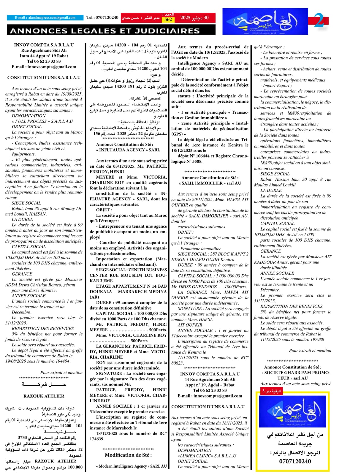 Annonces Légales et judiciaires نشر في 30 ديسمبر 2025 الساعة 15 و 27 دقيقة شارك العاصمة بريس الرباطAnnonces Légales et judiciaires شارك