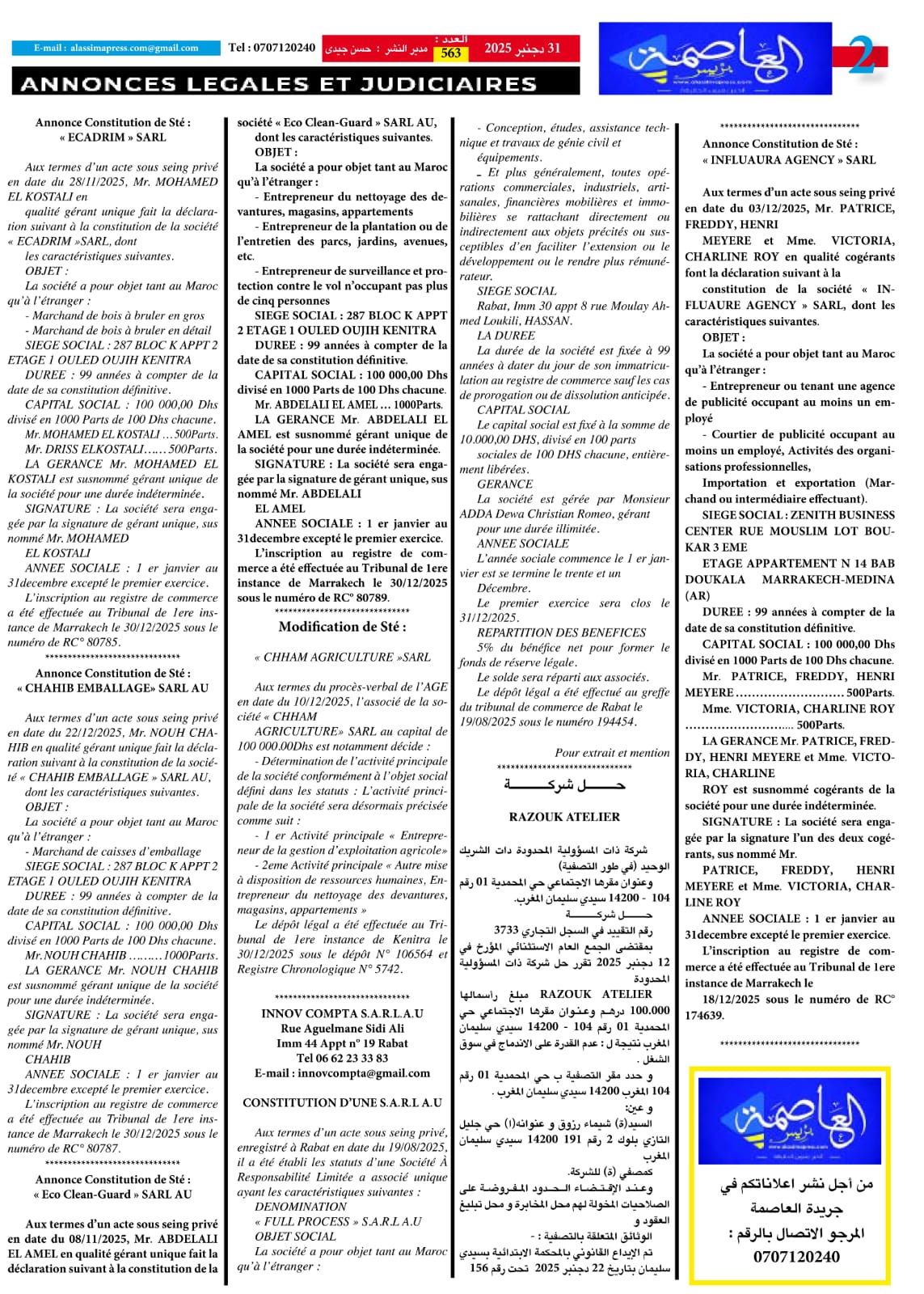 Annonces Légales et judiciaires نشر في 31 ديسمبر 2025 الساعة 13 و 10 دقيقة شارك العاصمة بريس الرباطAnnonces Légales et judiciaires شارك